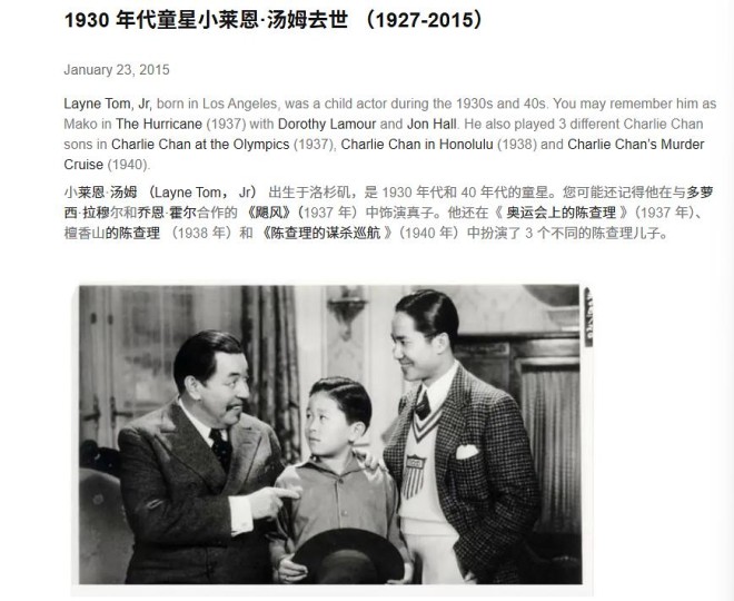 小莱恩·汤姆 (Layne Tom, Jr) 出生于洛杉矶,是 1930 年代和 40 年代的童星。您可能还记得他在与多萝西·拉穆尔和乔恩·霍尔合作的 《飓风》(1937 年)中饰演真子。他还在《 奥运会上的陈查理 》(1937 年)、檀香山的陈查理 (1938 年)和 《陈查理的谋杀巡航 》(1940 年)中扮演了 3 个不同的陈查理儿子。