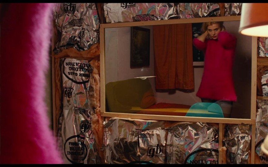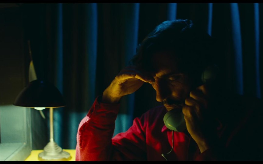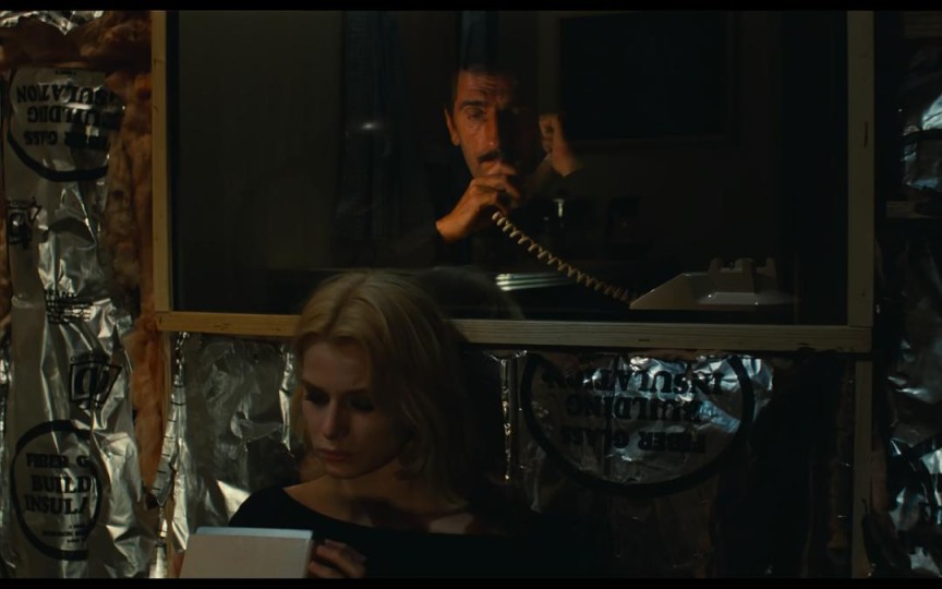 第一场戏,Travis进入隔间,扶着电话,等待着他期盼已久的金发女郎的到来。此时是Jane——全片的戏眼——第一次正面出镜,导演安排声音先行,持续营造暧昧的气氛。镜头随着Travis的眼神抬起戛然而转,在粗制滥造的布景之间穿着艳丽的Jane轻盈亮相,此时T能看见J,J并不清楚对面的那个男人是谁,这样一种奇异的不对称关系设计下,戏剧冲突自然而来,天才的巧思。紧接着就是独属于Jane和Travis二人的相互切换特写长镜头,这一段并不是普通的正反打,而是在台词切入人物内心的瞬间给予演员充分的表演空间。