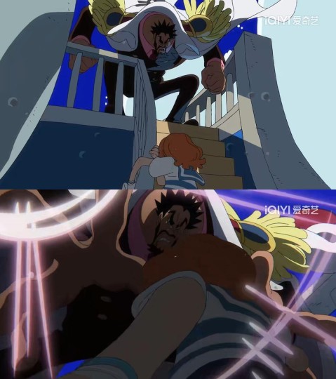 3. 从天而降拦女主的“仁王”和卡普在顶上阻拦路飞的动作、站位都很相似;