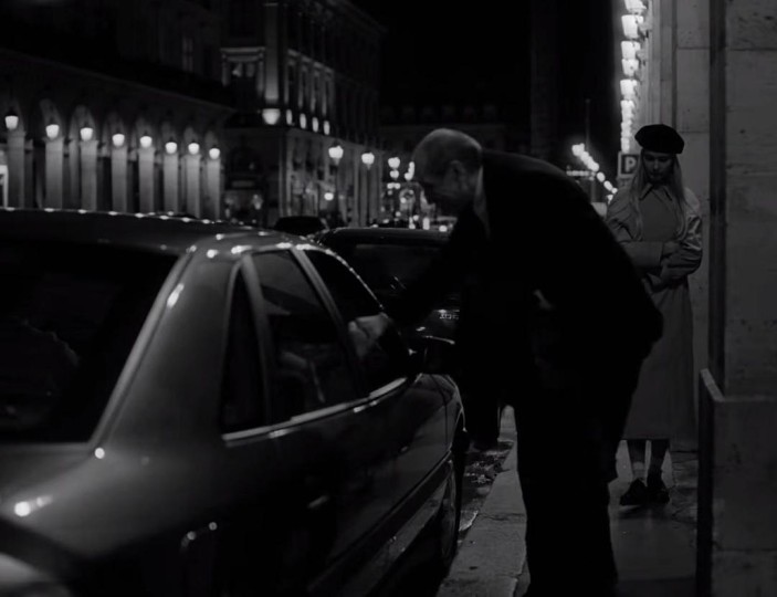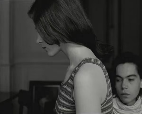 因此,如果有人在这里理解出了某种复古主义(即使戈达尔在采访中否认有制造复古的范式),那也是基于这样的直觉,这种时刻朝向着过去的,复调的当下。命名了影片的语词:爱的赞歌Éloge de l'amour中所蕴含的一种简单直接的浪漫主义愿景,将首先被这样一种复古的推行所占据。实际上,当音乐响起时,情感力量的溢出就会达成对图像之间分割的取消,哪怕这种分割断裂是戈达尔的某种招牌处理,它们也只能被覆盖在这种协律运作的光晕下——充满感情的朦胧光芒逐渐汇聚。也许这正是为了与“爱”这一主题相适,使得影像将始终构建于抒情之上?似乎这些试戏的段落,它们有时候仿佛被完全的情感力量所主导,乃至在一些评论当中被把握为了一种象征的图像——但是,没有,我们还没有什么确定性,正如这个漫长的故事还没确定下来任何选角,图像更多的是创作当中陷入的犹疑,停顿,语词也有过悬停的时刻。但我们仍在继续,影像仍在推行。我们还将持续见到更多演员来参与这个叙事计划,而他们的图像也将进入拍摄活动的目光。