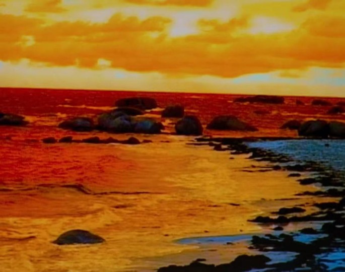 图像在寄喻的进程中逐渐获得了自身的直接性——那将会是一片风景,其形态正是图像的最真实的内容。影像沐浴在这一道全新的光线之下,因此,一片海岸,将以前所未见的,最艳丽的色彩现身。海浪的来回运动,拍打,这或许让人觉得平静,但其间的对立也未曾被遮掩,如岸边与海浪的暖色与冷色。两者又绝非仅仅是一种单色,而是更像是光线叠加了多层,以折射出了这样一层色域,被赋予了这种形态的风景,仿佛把自己作为某种原初质料那样注入进我们的目光中。在这个意义上,一片风景必然与曾在目光中停留过的风景关联——甚至可以说,此刻的影像整体正是过往黑白影像的绝对反色。这里过于艳丽,过于原初,也因此涌动着充沛的能量。《爱的赞歌》有了新的开端,自黑白当中的忧郁后,我们来到的是更早的过去,故事开头的开头——这也许作为一种戈达尔的策略,即讲一个漫长的故事的方法,就是不断地回到故事的开头,开头亦结尾——埃德加的犹疑来到了这样一种结尾,此处他那创作的起源被再度回想起来,而野兽派画作般的直觉则是这溯源工作当中的伴侣——一如起源的探究是为了去确证能动性何以生成,影像自那片海岸后,亦变成了一类持续呼唤着折返运动的风景。